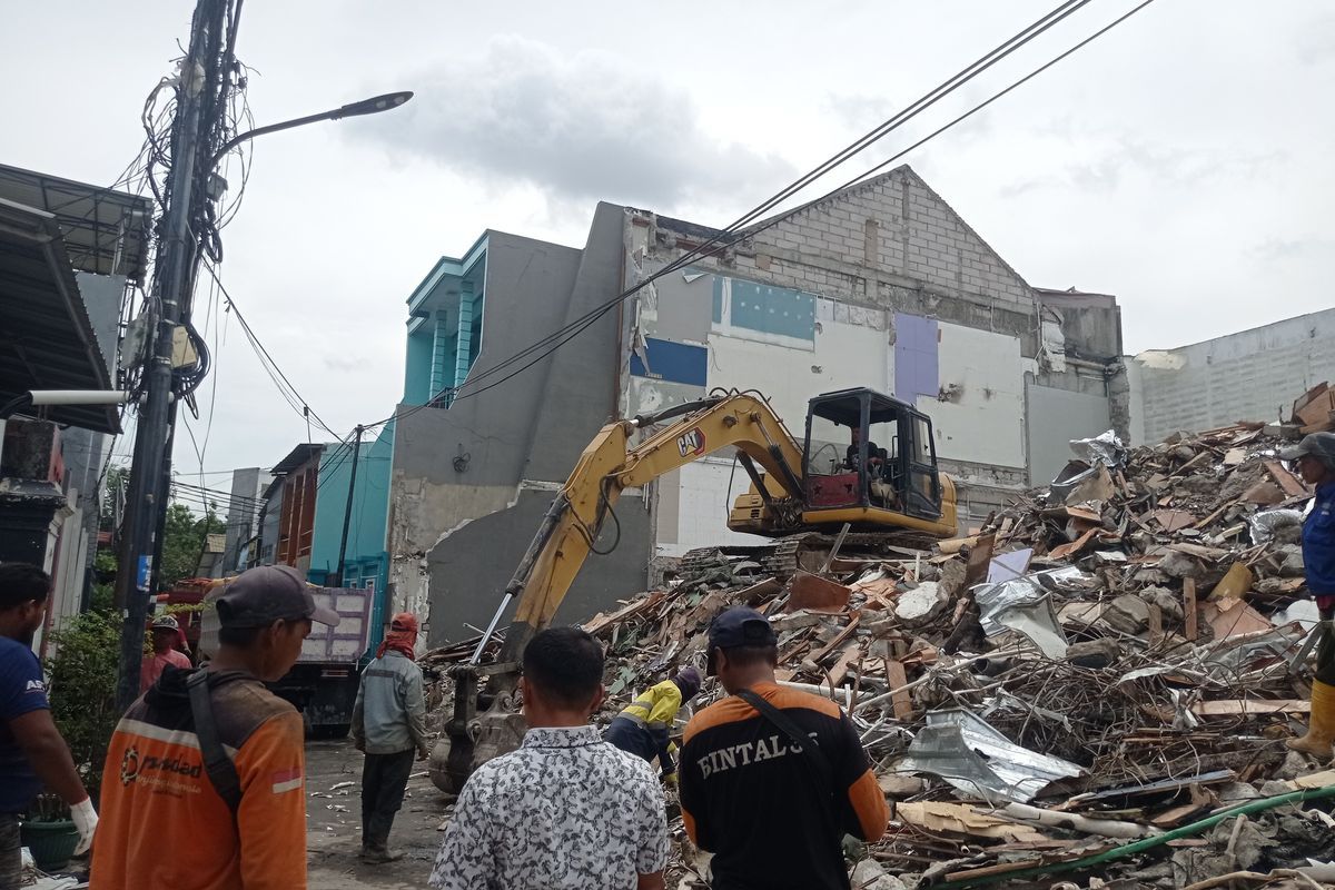 Tumpukan kayu, besi, bebatuan, hingga potongan pipa terlihat berserakan di lahan tersebut. Debu sesekali beterbangan saat alat berat menggerakkan puing bangunan dan memindahkannya ke truk-truk pengangkut. Beberapa pekerja memakai baju berwarna biru bertuliskan nama Ahmad Sahroni.