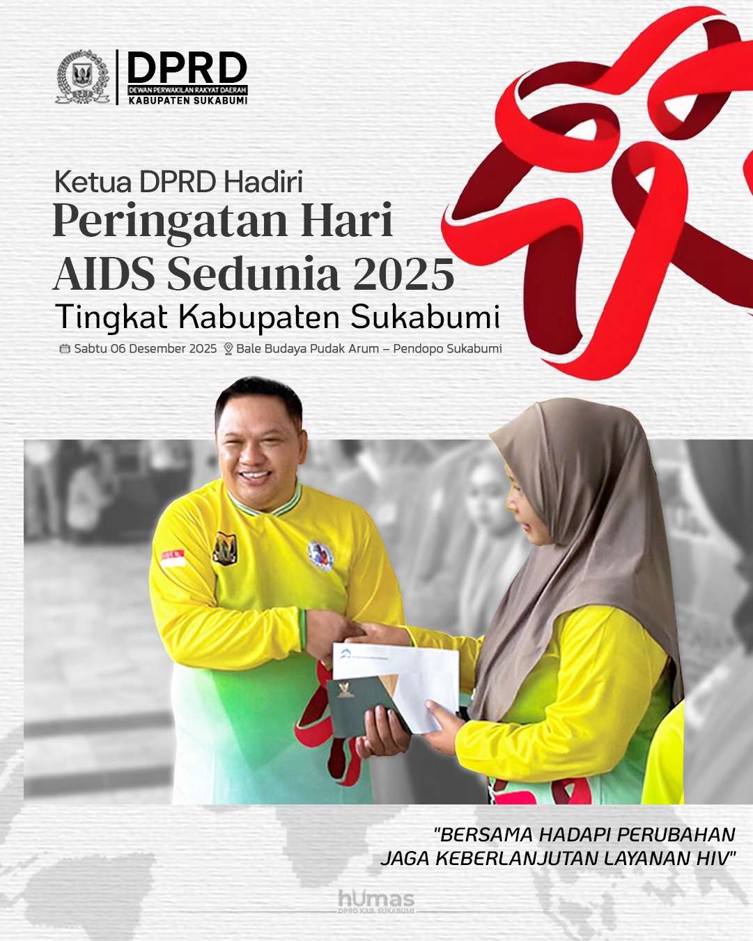 Sukabumi – DPRD Kabupaten Sukabumi menyampaikan peringatan Hari AIDS Sedunia pada 6 Desember 2025. Ketua DPRD, Budi Azhar Mutawali, mengajak masyarakat meningkatkan kesadaran, mendukung pencegahan HIV/AIDS, serta menghentikan stigma terhadap orang yang hidup dengan HIV/AIDS.