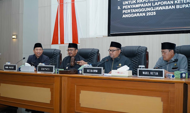 Dalam rapat tersebut dibahas sejumlah agenda penting, di antaranya laporan hasil reses ke-1 DPRD tahun 2026, penyampaian pokok-pokok pikiran DPRD untuk Rencana Kerja Pemerintah Daerah (RKPD) tahun 2027, serta nota pengantar Laporan Keterangan Pertanggungjawaban (LKPJ) Bupati Tahun Anggaran 2025.